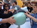 Un afiliado toca un detalle de uno de los monumentos falleros